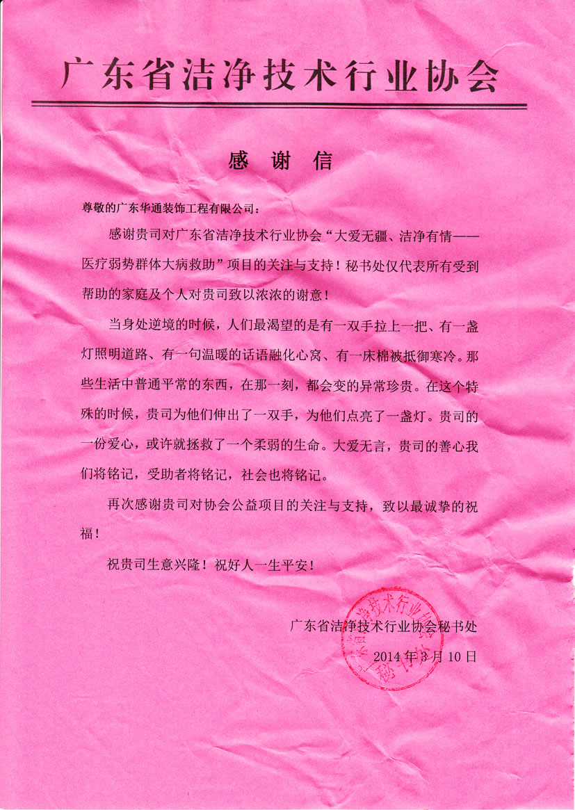 :2014年3月10日,广东省洁净技术行业协会致我公司《感谢信》:“大爱无疆,洁净有情——医疗弱势群体大病救助”。