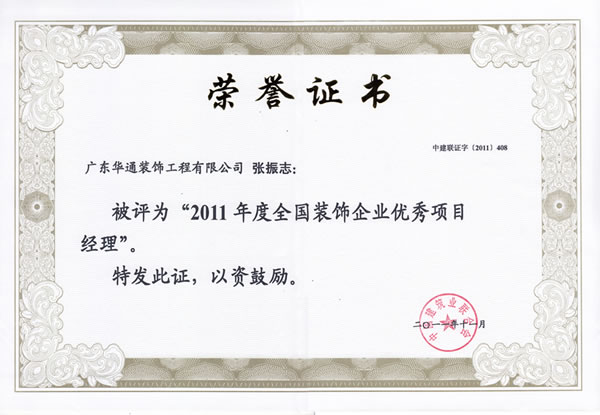2011年11月28-30日在北京国家会议中心,中国建筑业联合会召开了“2011中国建筑业/房地产全国(第三届)会议”,会议表彰了134个先进企业、89名先进个人和61个优质工程,并颁发了奖状和证书。广东华通装饰工程有限公司张振志、钟作明、李孟华三位员工荣获“2011年度全国装饰企业优秀项目经理”称号。
