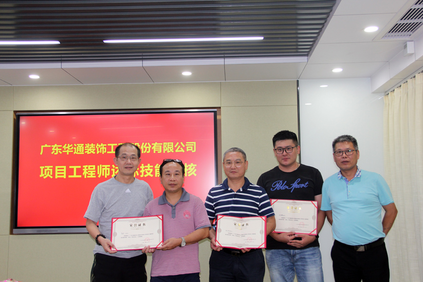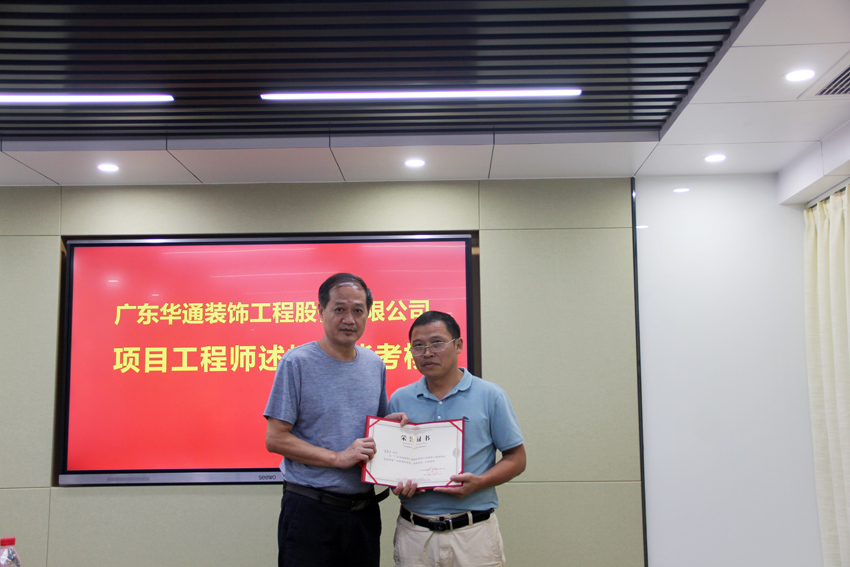 2020 年7月13日晚上19点40分整,广东华通装饰工程股份有限公司在总部会议室进行“项目工程师述标技能考核”,公司高管及惠州专家5人对项目工程师进行了问答考核,并采取无记名打分的方式评选出优秀奖、优胜奖和鼓励奖,公司部门经理和项目经理10余人参与了现场观摩。