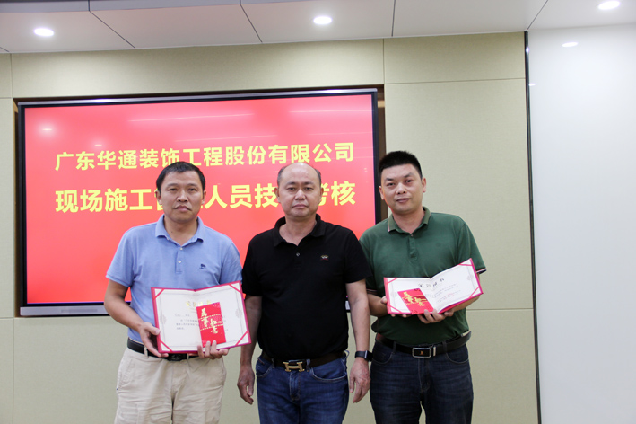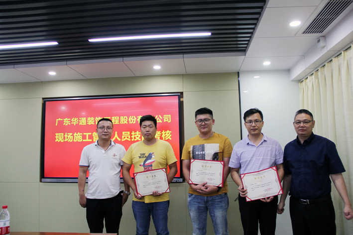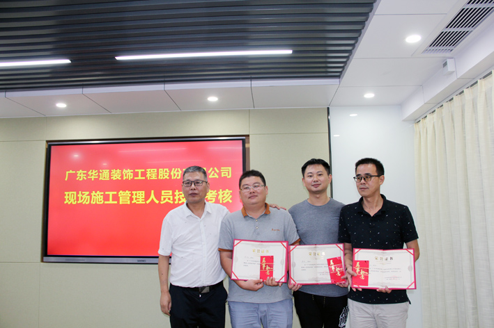 2020年7月31日晚上19点整,广东华通装饰工程股份有限公司在总部会议室进行“现场施工管理人员技能考核”,公司高管5人对 现场施工管理人员进行了问答考核,并采取无记名打分的方式评选出优秀奖、优胜奖、优良奖和鼓励奖,公司部门经理和项目经理10余人参与了现场观摩。