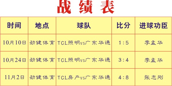 :2011年10月10日,《华通足球俱乐部》正式组建,该俱乐部先后与“TCL照明电器有限公司”、“TCL房地产有限公司”进行了三场友谊赛。