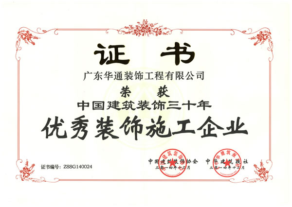 广东华通装饰工程有限公司荣获《中国建筑装饰三十年优秀装饰施工企业》称号。