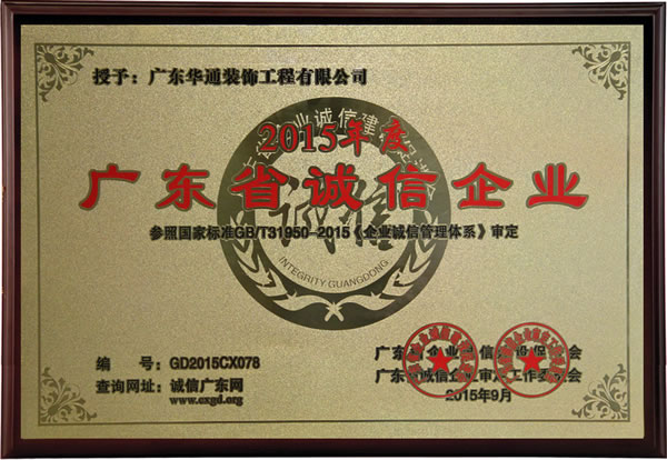在2015年10月开展的广东省诚信评定活动中, 广东华通装饰工程有限公司荣获《2015年度广东省诚信企业》称号。此次诚信企业的考评率先参照国家标准GB/T31950-2015《企业诚信管理体系》及广东省诚信企业审定办法进行考评,并报省工商局、省国税局等6个相关部门会审,最后经广东省诚信企业评定工作委员会审定。