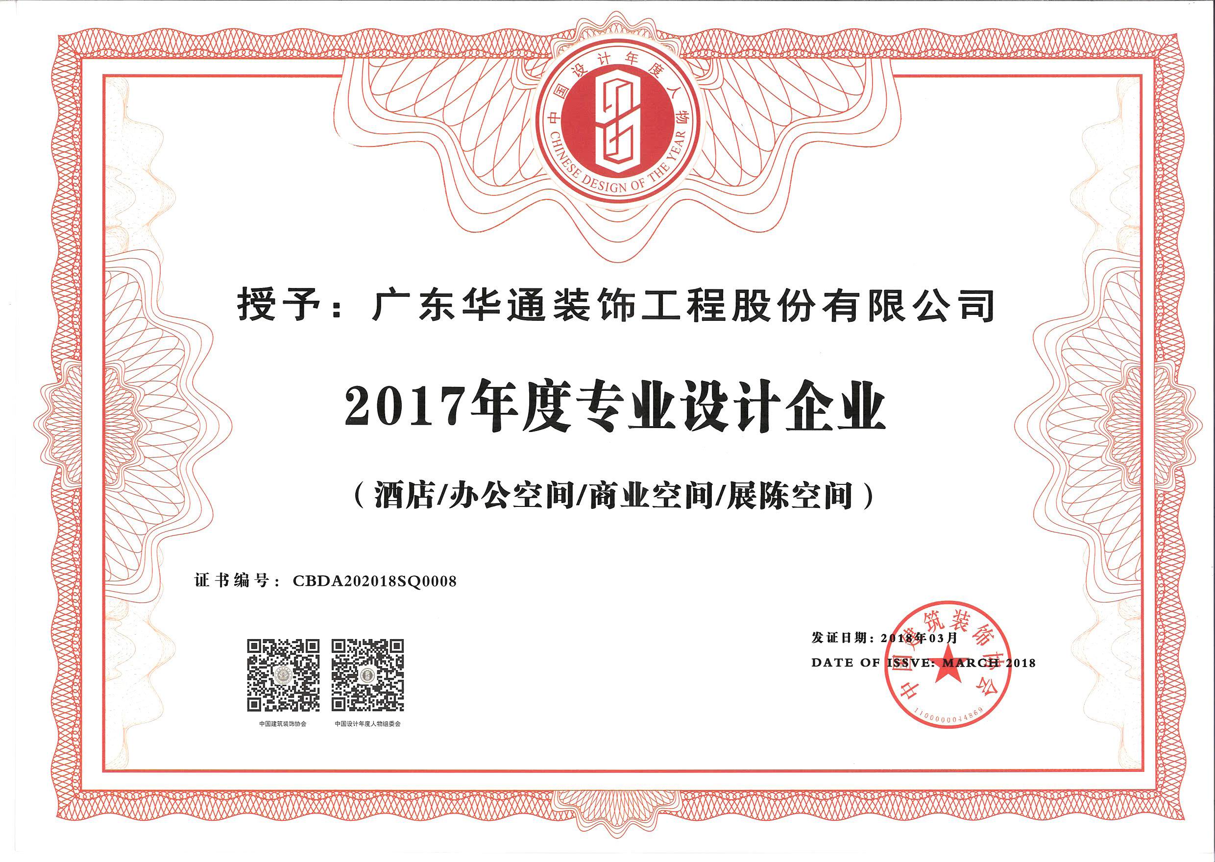 :广东华通公司荣获中国建筑装饰协会颁发“2017年度专业设计企业”称号。