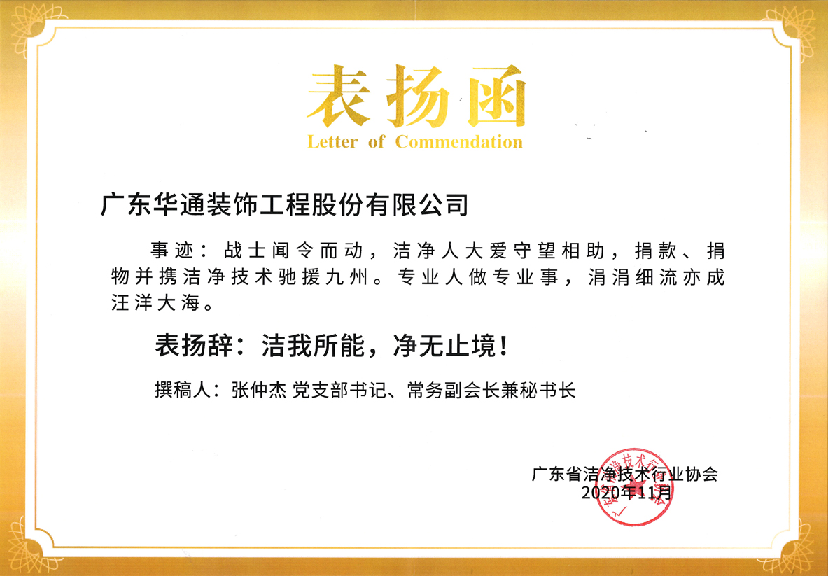 11月28日,在佛山南海影视城枫丹白鹭酒店隆重召开“广东省洁净技术行业协会第二届第四次会员代表的大会”,省社会管理局监管处处长陈炯生、省洁净协会会长余小彪及50多家企业代表出席会议。会议表彰了在抗击新冠病毒工作中做出特殊贡献的企业,广东华通装饰工程股份有限公司工程监察中心经营部经理钟作明代表公司上台领奖。